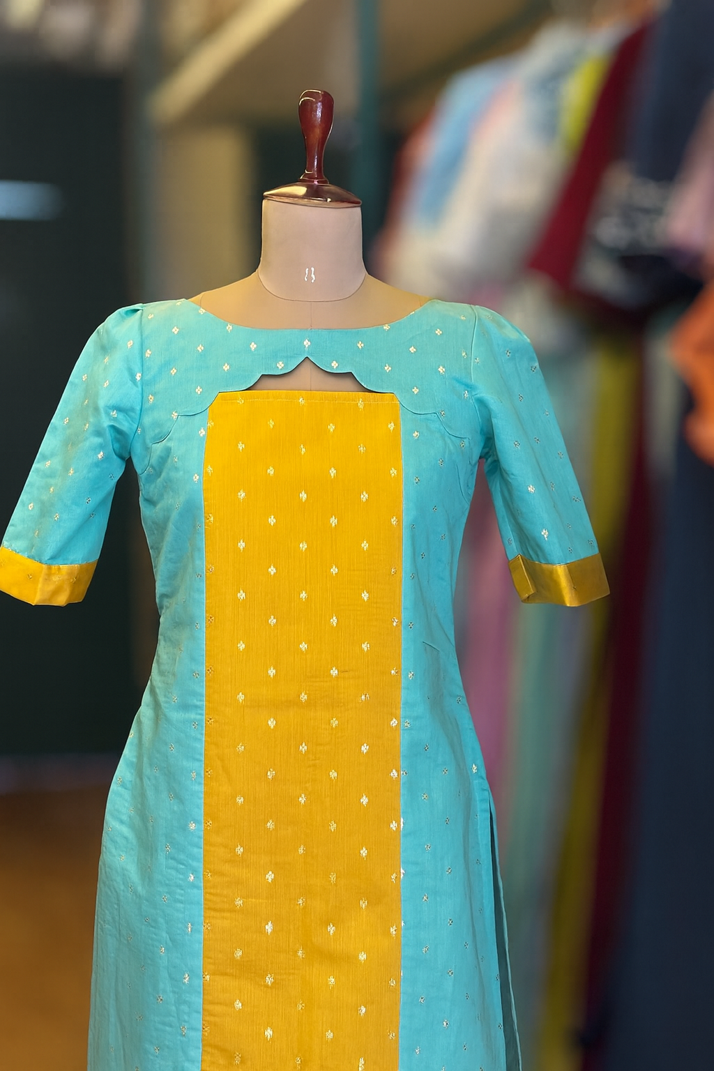 Step into serenity with Morning Dew, a refreshing harmony of colour and calm. Crafted from premium handwoven fabric, this kurthi features a tranquil turquoise body gracefully contrasted with a soft yellow woven panel, adorned with subtle motifs that reflect understated elegance.